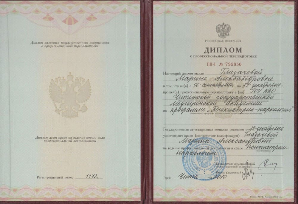 Психиатр-нарколог. Стаж 12 лет. Окончила Читинскую Медицинскую Академию в 2009, прошла интернатуру по психиатрии, специализацию по наркологии. Начала свою врачебную деятельность в 2010 году.
